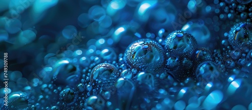 A close up view of numerous water droplets delicately resting on the surface of a fresh blue plum. The droplets refract light, creating a sparkling effect that highlights the texture of the plum.