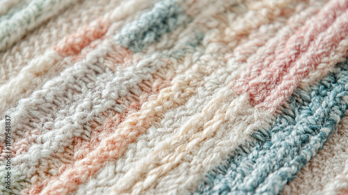 A close view of woven fabric with a coarse texture and soft pastel colors.