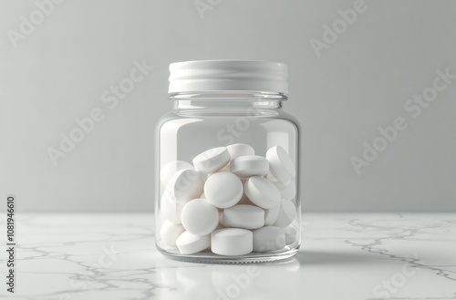 A closed glass transparent jar with white tablets, or medicines, or vitamins stands on a light marble table on a white background. A close-up of a medicine without a label