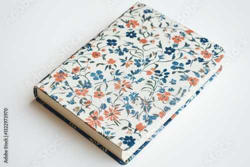A closed notebook featuring floral patterns on a white surface
