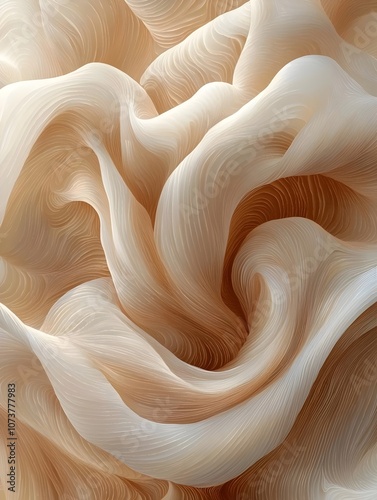 A close-up abstract image featuring flowing, soft beige and cream-colored waves, resembling delicate fabric or organic forms, creating a serene and dreamy atmosphere.