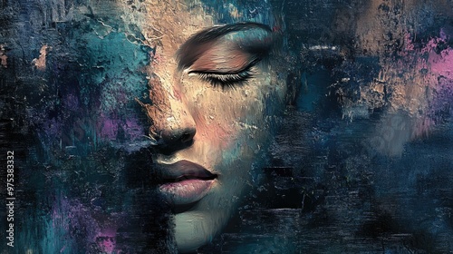A close-up, abstract oil painting of a woman's face with eyes closed, rendered in a painterly style, with bold strokes and textured brushwork.