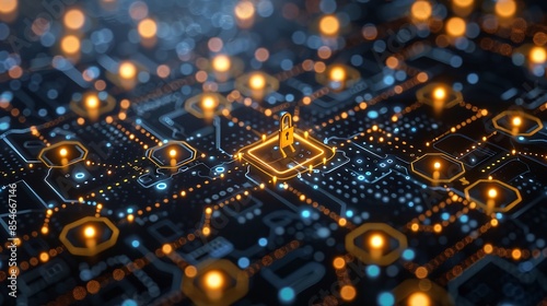 A close-up, abstract representation of a circuit board with glowing, illuminated nodes