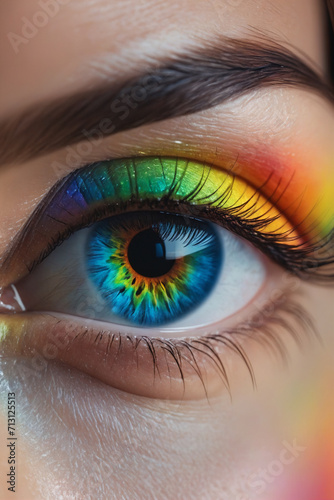 A close-up beautiful eye of a female person, iris with rainbow colors, cinematic light