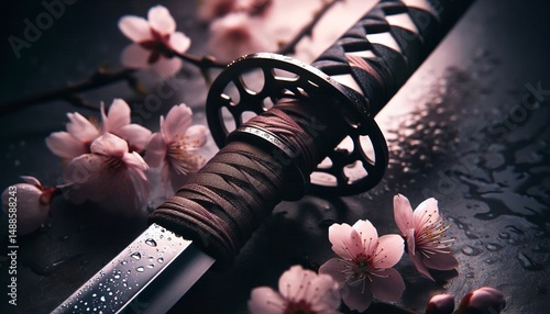 A close-up detail of a samurai sword blade adorned with delicate cherry blossoms and sparkling water droplets against a dark background