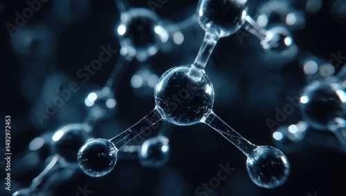 A close-up digital rendering of a molecular structure with interconnected atoms on a dark background.