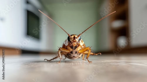 A close-up image of a cockroach on the floor with a softly blurred indoor background, highlighting its features and the environment's nuanced lighting.