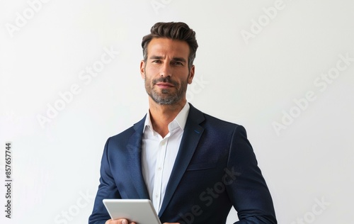 A close-up image of a confident man in a blue suit holding a tablet against a plain backdrop.
