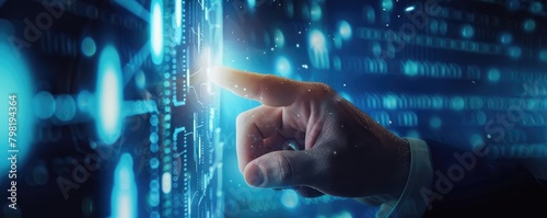 A close-up image of a hand interacting with futuristic holographic fingerprint technology in a dark environment Highlights the concept of biometric authentication.