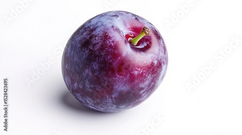A close-up image of a ripe, dark purple plum with a small green stem, set against a clean white background.