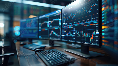 A close-up monitors which reflect stock market data at the current moment and analyze stock market data. They depict charts, graphs of stock. Generative AI.