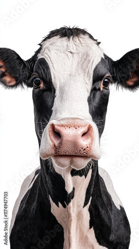 A close-up of a black and white dairy cow on a transparent background, presenting a cinematic focus on its distinctive features.