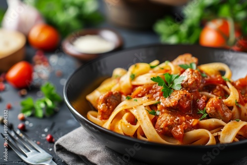 A close-up of a bowl of pasta with meat sauce, garnished with fresh parsley, surrounded by ingredients like tomatoes and garlic on a dark background