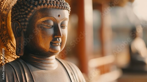 A close-up of a Buddha statue peaceful expression, with intricate lotus carvings visible below, and the background softly blurred to allow for generous copy space
