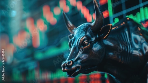 A close-up of a bull statue in front of a stock market display, symbolizing financial growth and optimism.