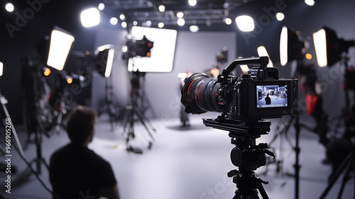 A close-up of a camera capturing high-quality video content in a well-lit studio environment