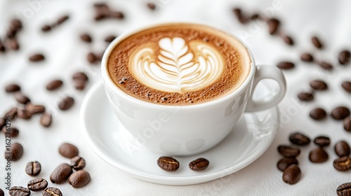 A close-up of a cappuccino cup with latte art, surrounded by coffee beans, on a seamless white background.