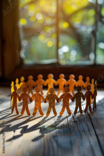 A close-up of a charming paper-cut figures arranged in a circle on a wooden floor by a sunlit window, symbolizing unity and togetherness.
