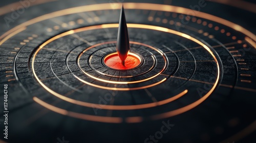 A close-up of a circular design featuring concentric rings and a central pointed element, radiating warm colors and intricate textures.