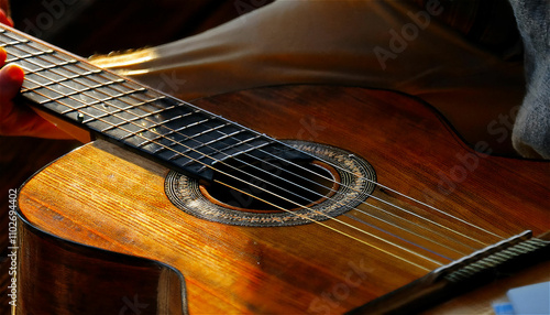 A close-up of a classical guitar resting on a wooden floor, with warm, soft lighting