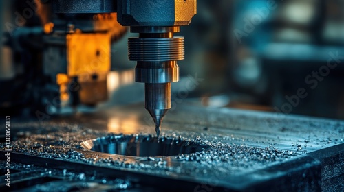A close-up of a CNC machine carving out a metallic shape, dark industry background