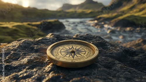 A close-up of a compass resting on a rock near a river surrounded by lush greenery and mountains during the golden hour