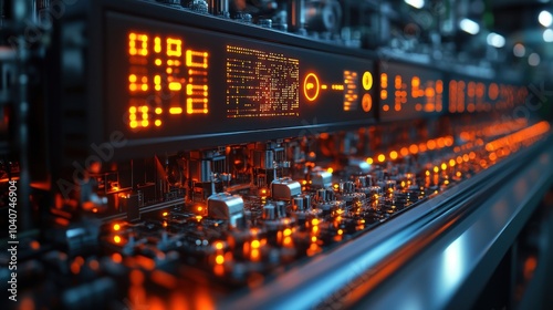 A close-up of a complex, illuminated industrial control panel.
