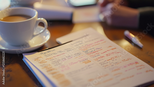 A close-up of a conference agenda with handwritten notes and a cup of coffee beside it (1)