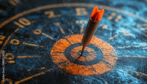 A close-up of a dart piercing the center of a dartboard, showcasing precision and focus in a vibrant, colorful setting.