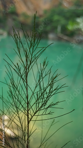 A close-up of a delicate, wispy plant branch in the foreground with a soft, blurred background of a calm, green-blue body of water and natural scenery, evoking a peaceful and serene atmosphere.