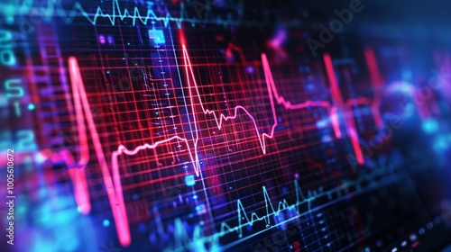 A close-up of a digital display with a bright red heartbeat line, pulsating rhythmically. The screen also displays other data and graphs in a futuristic style.