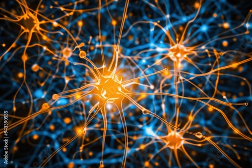 A close-up of a digital representation of a neural network, featuring vibrant orange and blue hues. The intricate network of interconnected neurons highlights the complexity of brain activity