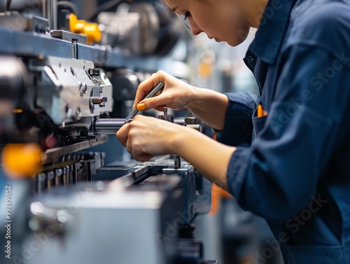 A close-up of a factory worker adjusting a piece of machinery with precision tools, ensuring that the equipment functions smoothly and accurately