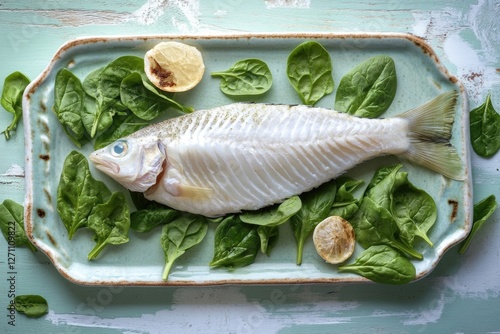 A close-up of a fresh fish, possibly tilapia or catfish, with a garnish of spinach leaves and possibly lemon wedges.