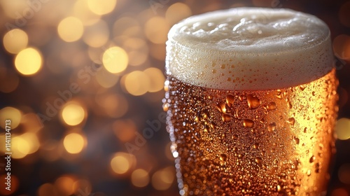 A close-up of a frothy beer in a glass, set against a blurred, sparkling background.