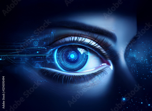 A close-up of a futuristic eye, glowing with vibrant blue circuitry, merging organic and technological elements against a dark, space-like background. The image evokes themes of cybernetics and artif