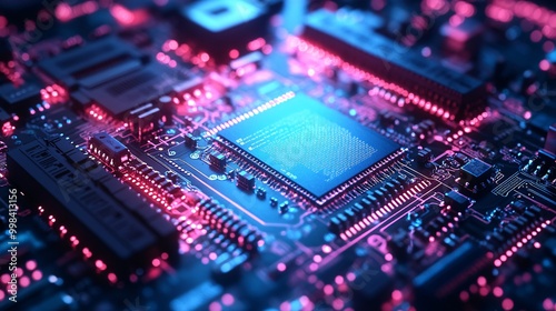 A close-up of a futuristic microchip embedded on a circuit board, with illuminated blue and orange pathways, symbolizing advanced technology and innovation.