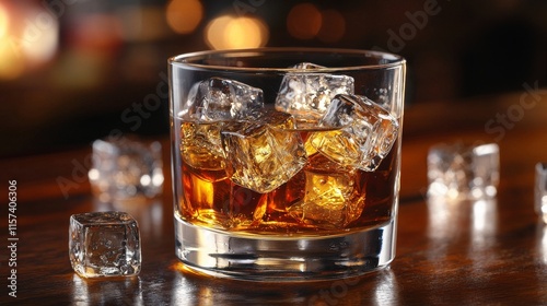 A close-up of a glass filled with whiskey and ice cubes, showcasing a rich amber color, set on a wooden surface with a warm, blurred background.