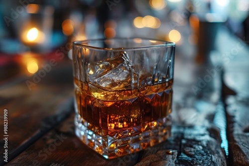 A close-up of a glass of amber liquid with ice on a wooden surface