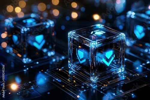 A close-up of a glowing blue glass cube with an abstract symbol on a futuristic background.