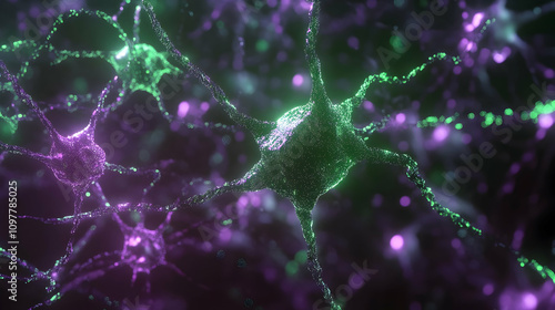 A close-up of a glowing green and purple neuron, highlighting its intricate branching connections.