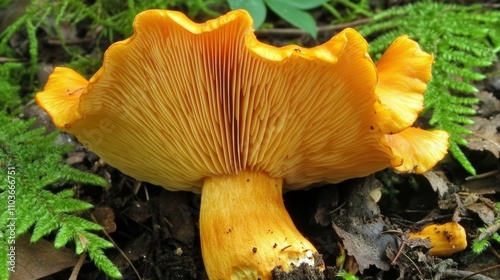 A close-up of a golden chanterelle mushroom surrounded by damp forest debris with a faint beam of sunlight