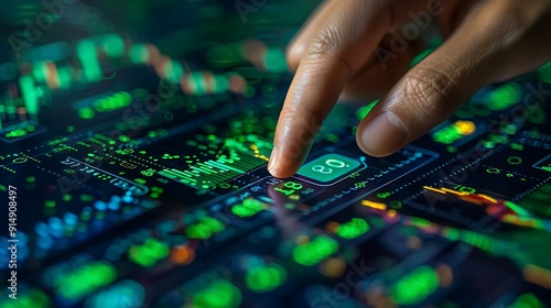 A close-up of a hand confidently pressing the buy button on a digital stock market interface, with green rising stock charts in the background, detailed fingers and button,