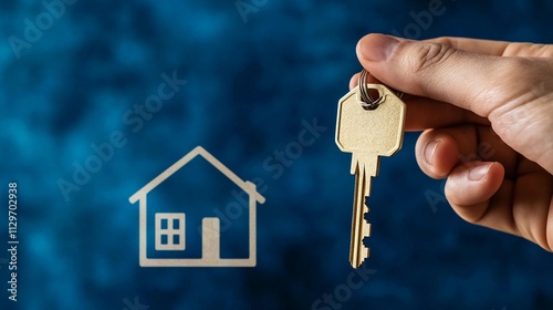 A close-up of a hand holding a key, with the outline of a smaller house on a blue background, symbolizing the transition to a downsized property, real estate downsizing and moving concept
