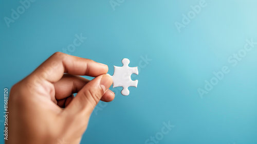 A close-up of a hand holding a single white puzzle piece against a plain blue background, symbolizing problem-solving, teamwork, and the last piece of the puzzle.