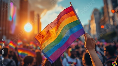 A closeup of a hand holding a small rainbow flag, with a crowd in the background
