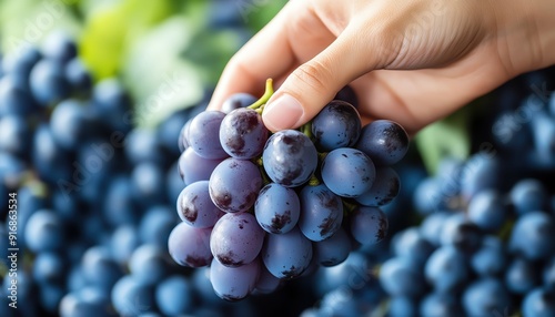 A close-up of a hand holding fresh, plump grapes, showcasing their rich purple color and ripe texture against a blurred background.