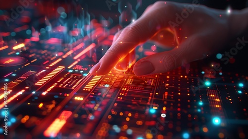 A close-up of a hand hurriedly pressing the sell button on a futuristic stock market interface, with multiple red downward-trending arrows in the background, fingers in focus, vibrant display,
