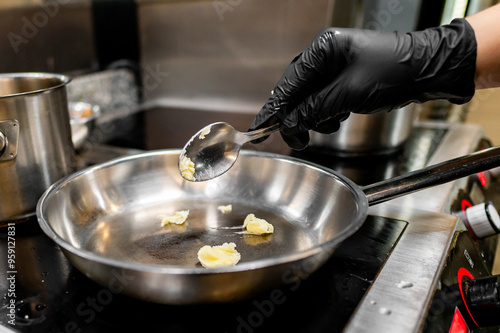 A close-up of a hand in a black glove adding butter to a stainless steel frying pan on a stove, capturing the action and warmth of cooking in a kitchen. Perfect for culinary, cooking
