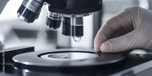 A close-up of a hand in a glove placing a sample under a microscope in a laboratory, with a focus on the precision of the work.